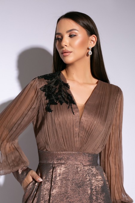 Decolteu in V cu insertie de tull si aplicatie de dantela pe umar