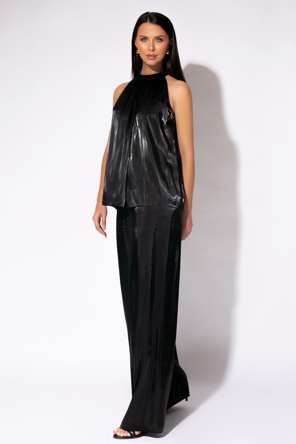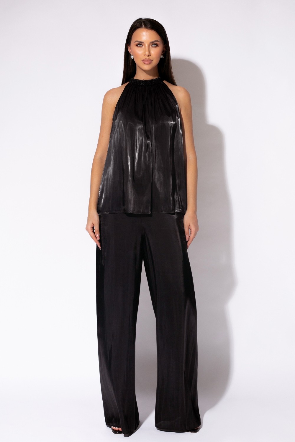Set din două piese, format din top lejer cu decolteu la baza gâtului, accesorizat cu mărgele, și pantaloni cu croi larg, într-o linie fluidă. Topul este evidențiat de căderea amplă și finisajul satinat, iar pantalonii completează ținuta cu un aspect elegant și echilibrat.