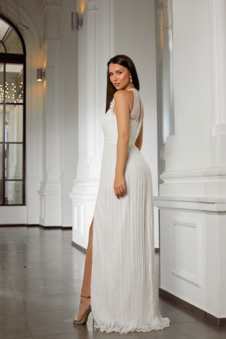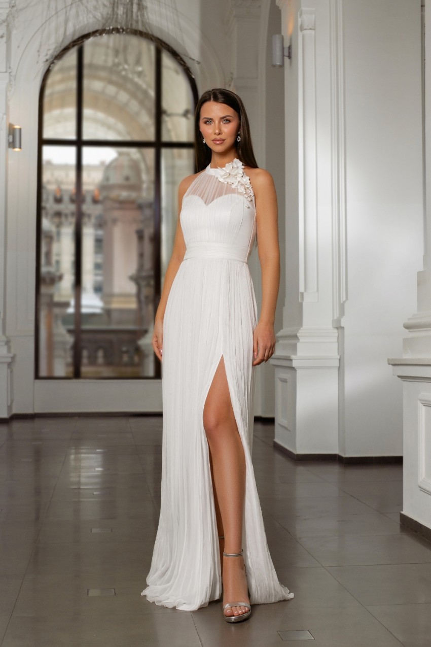 Rochie lungă din mătase naturalăBust confecționat din fronseuri de mătase realizate manual cu accesoriuFustă confecționată din fronseuri de mătase, căptușeală satinată pentru un plus de confortÎnchidere cu fermoar ascuns pe mijloc de spateTalie marcată