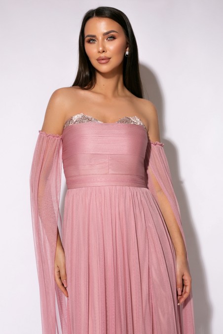 Rochie lunga din tull de matase naturala, evidențiată de bustul tip corset, realizat din tull de mătase, care urmărește forma corpului și pune în valoare zona superioară. Decolteul este accentuat de aplicații fine în partea superioară, iar umerii sunt lăsați liberi, fiind completați de mâneci din tull de mătase, detașabile. Fusta este amplă, plisată, cu cădere fluidă, și prezintă crepeu lateral.