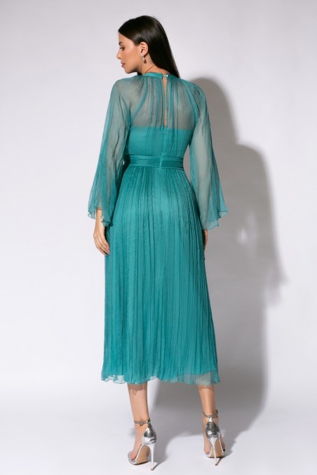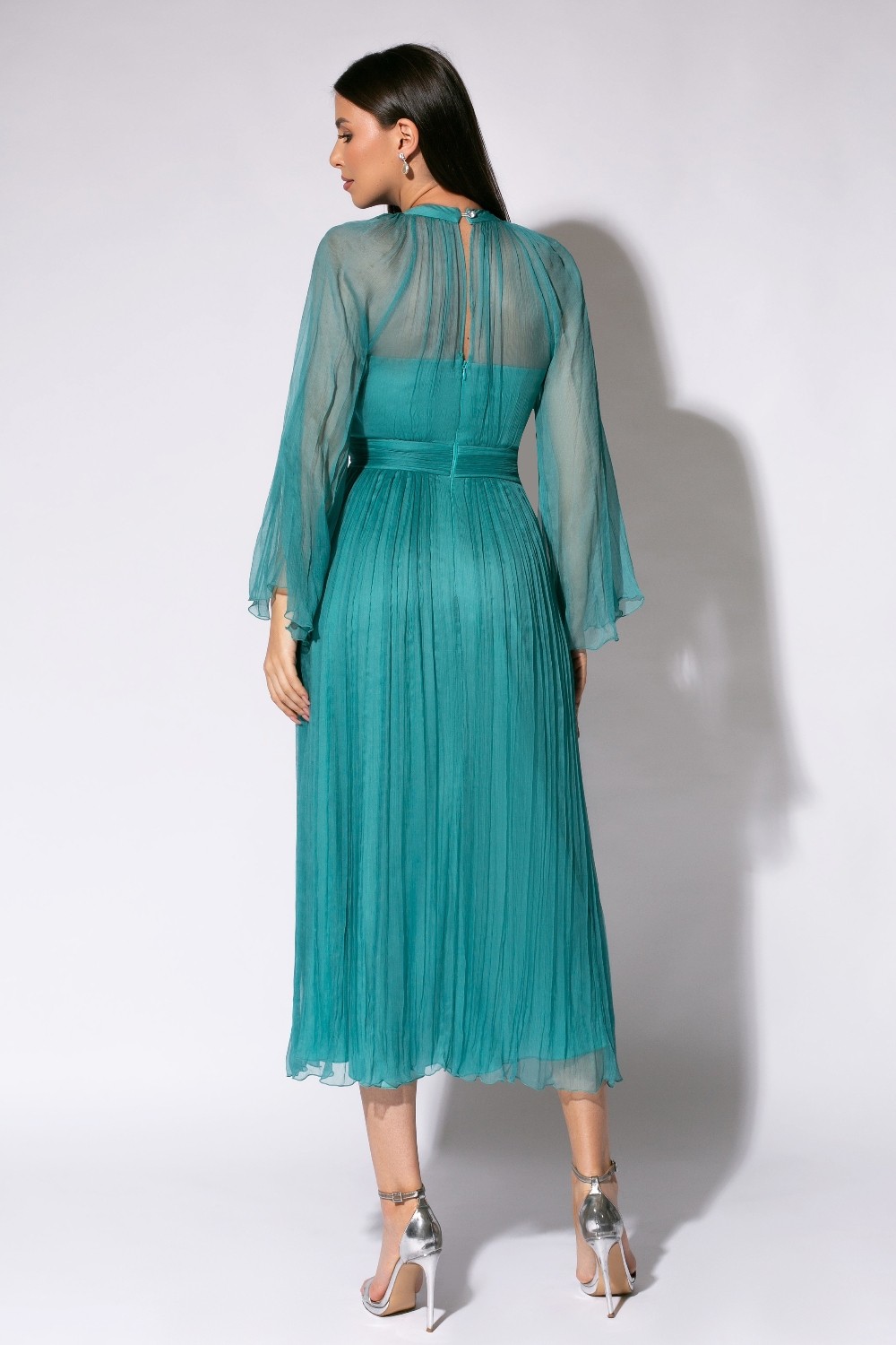 Rochie din mătase naturală, cu bust realizat din pliuri verticale care urmăresc linia corpului și conturează subtil talia. Aplicațiile florale 3D realizate manual la decolteu adaugă un detaliu distinctiv, iar mânecile-capă din voal de mătase completează armonios silueta. Banda lată din mătase marchează talia, iar fusta plisată cade fluid, oferind mișcare și lejeritate.