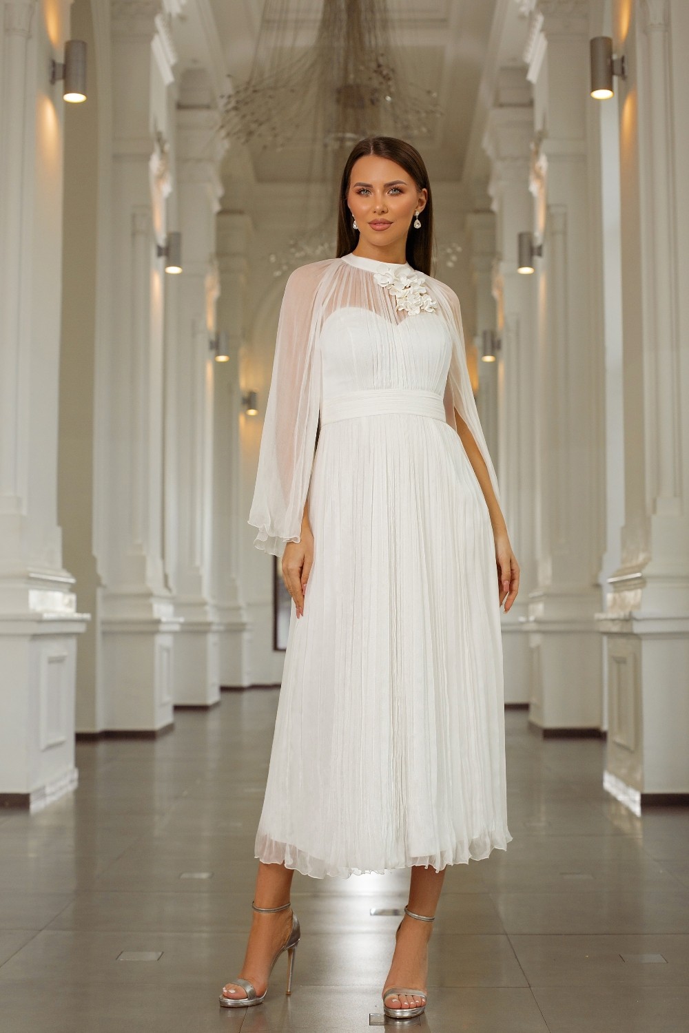 Rochie din mătase naturală, cu bust realizat din pliuri verticale care urmăresc linia corpului și conturează subtil talia. Aplicațiile florale 3D realizate manual la decolteu adaugă un detaliu distinctiv, iar mânecile-capă din voal de mătase completează armonios silueta. Banda lată din mătase marchează talia, iar fusta plisată cade fluid, oferind mișcare și lejeritate.