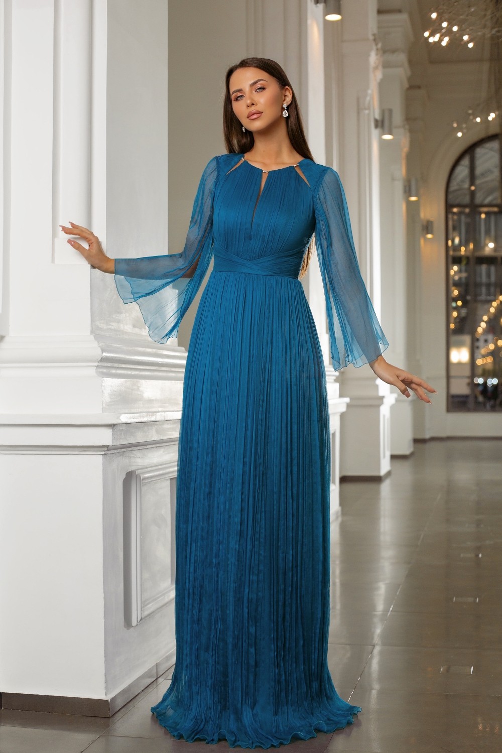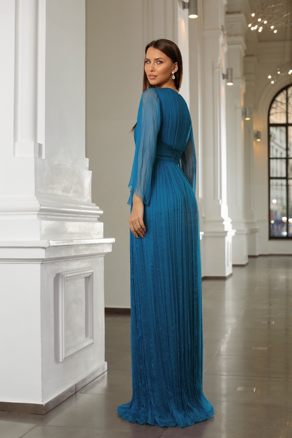 Rochie lungă din mătase naturală, cu bust realizat din fronseuri care conturează subtil talia. Decolteul cu decupaj și strasuri discrete. Mânecile din voal de mătase au volum lejer și completează armonios silueta.